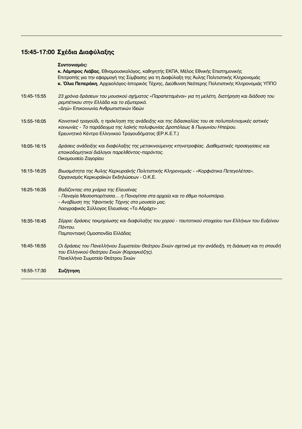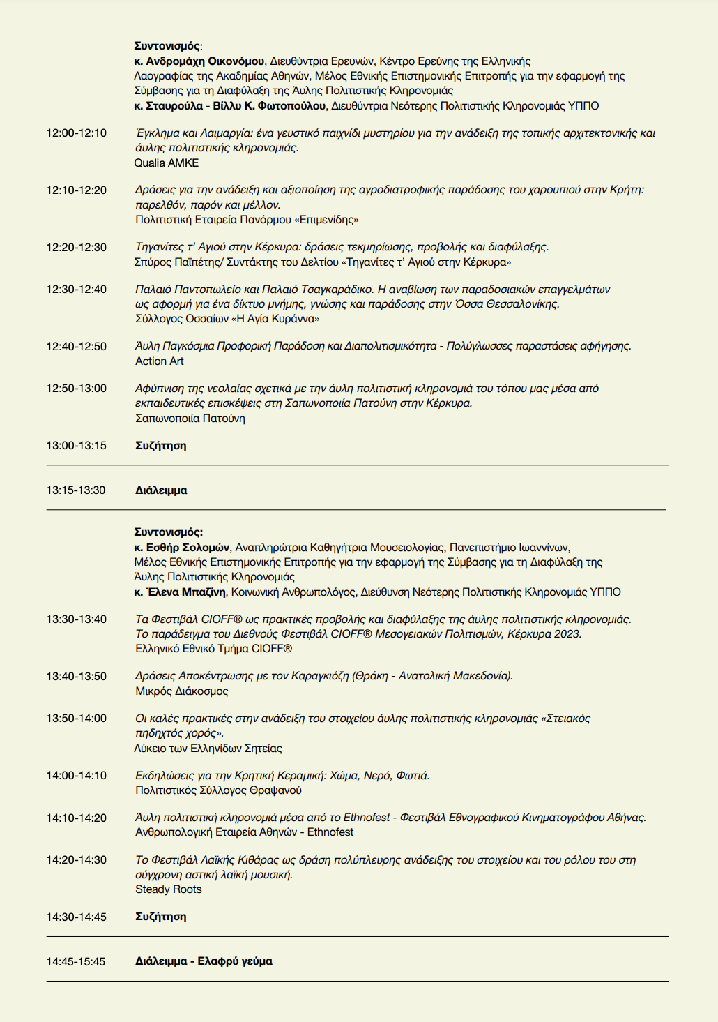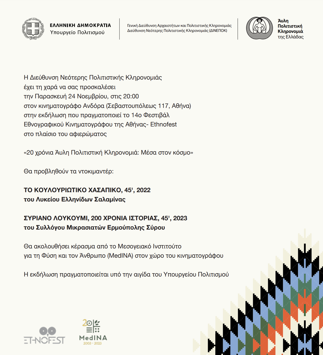 Με ιδιαίτερη χαρά σας ανακοινώνουμε το πρόγραμμα του εορταστικού τριημέρου που διοργανώνει η Διεύθυνση Νεότερης Πολιτιστικής Κληρονομιάς του Υπουργείου Πολιτισμού, με αφορμή τα είκοσι χρόνια από την υιοθέτηση της Σύμβασης για τη Διαφύλαξη της Άυλης Πολιτιστικής Κληρονομιάς (UNESCO 2003).