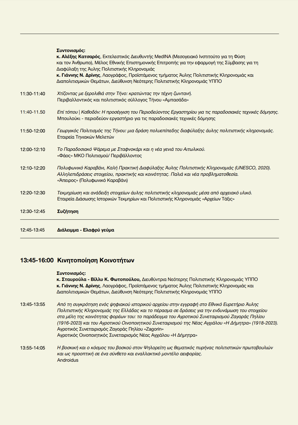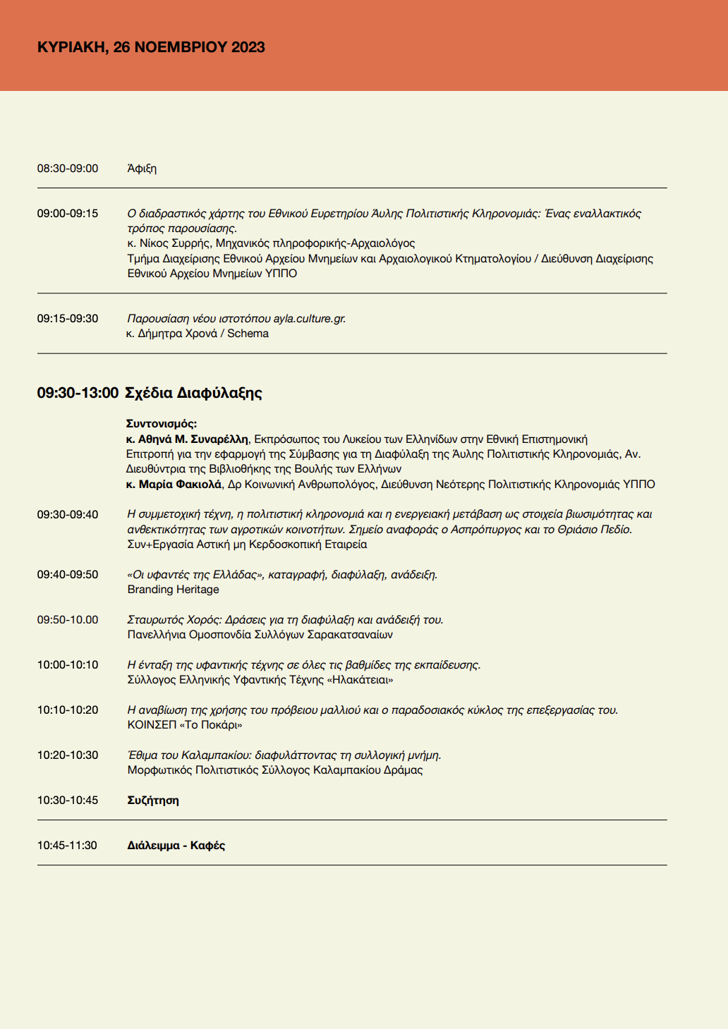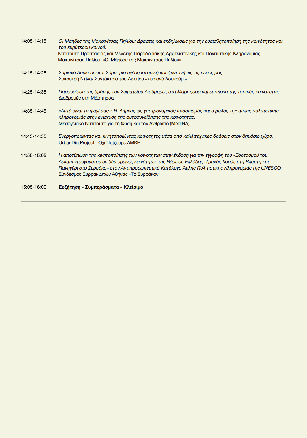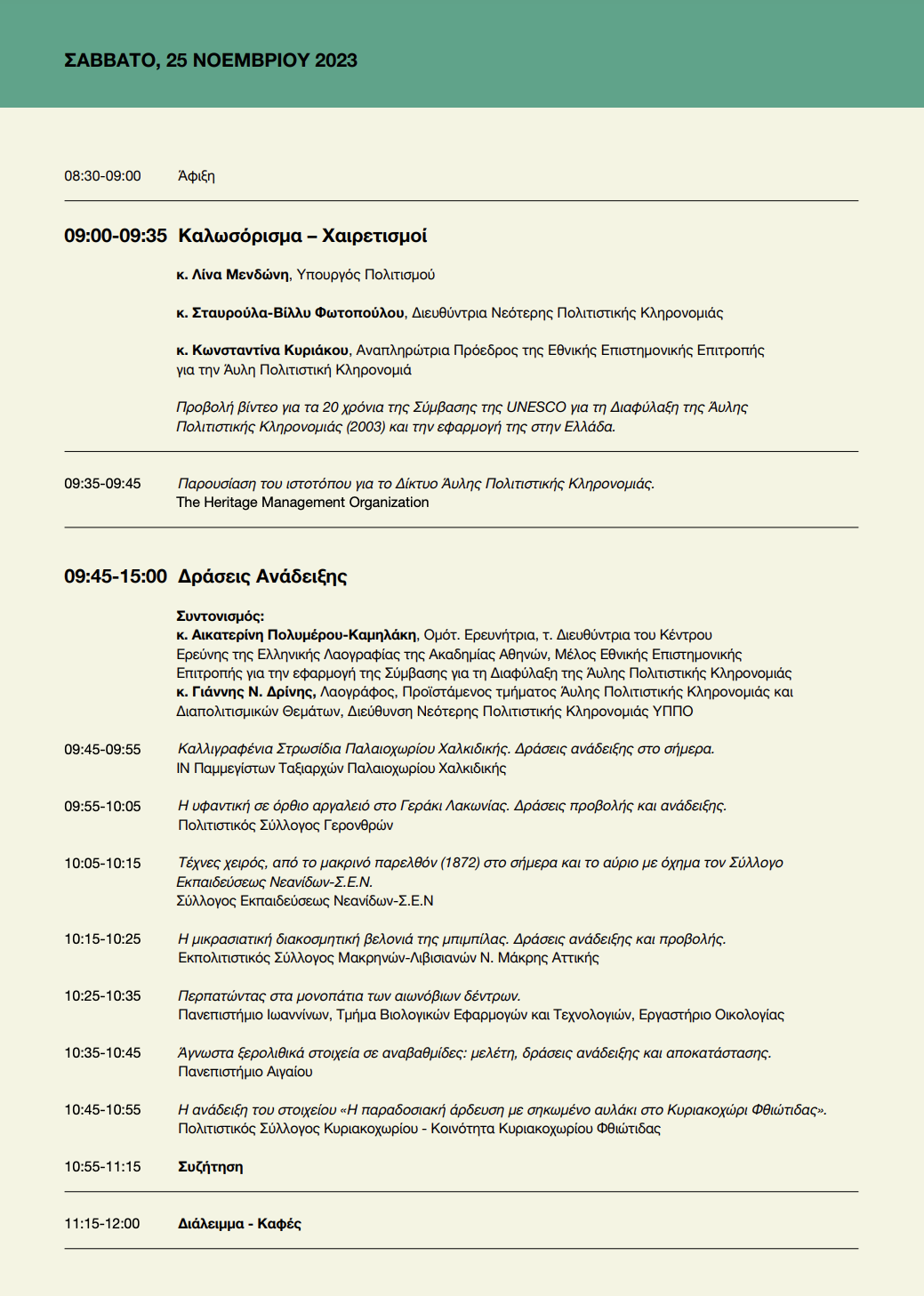 Με ιδιαίτερη χαρά σας ανακοινώνουμε το πρόγραμμα του εορταστικού τριημέρου που διοργανώνει η Διεύθυνση Νεότερης Πολιτιστικής Κληρονομιάς του Υπουργείου Πολιτισμού, με αφορμή τα είκοσι χρόνια από την υιοθέτηση της Σύμβασης για τη Διαφύλαξη της Άυλης Πολιτιστικής Κληρονομιάς (UNESCO 2003).