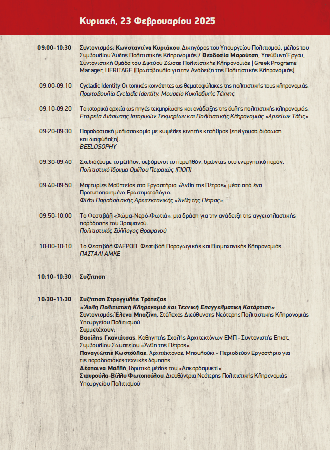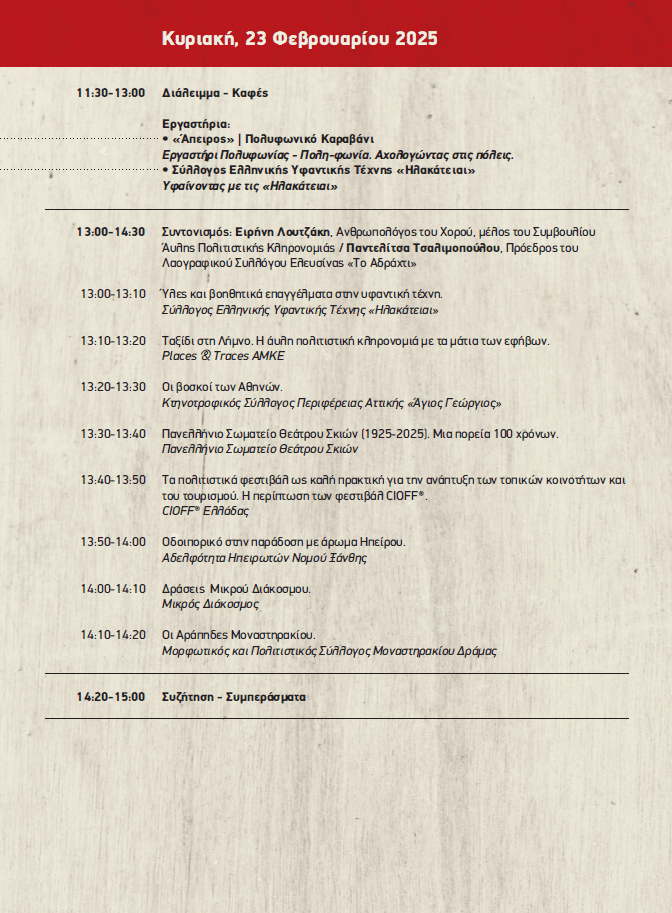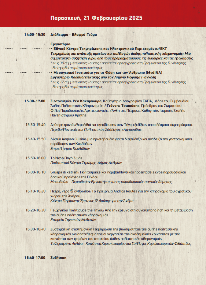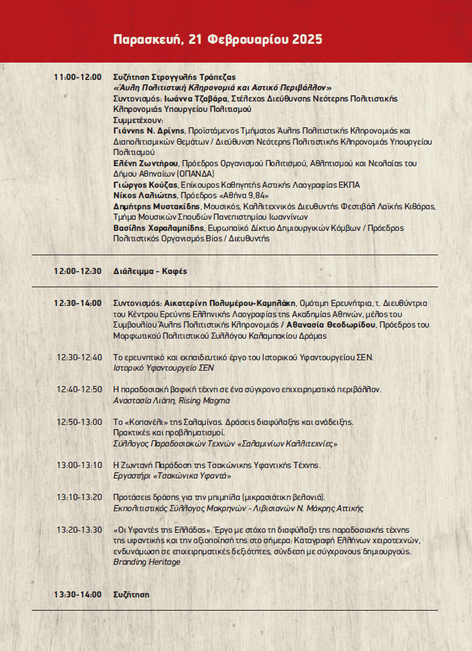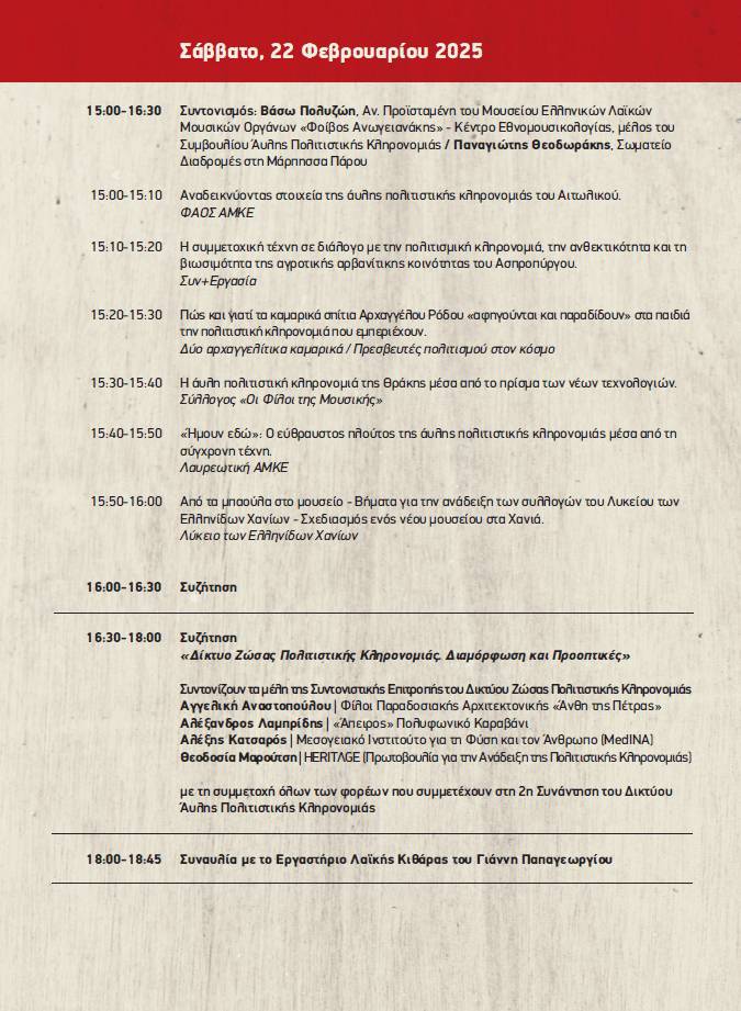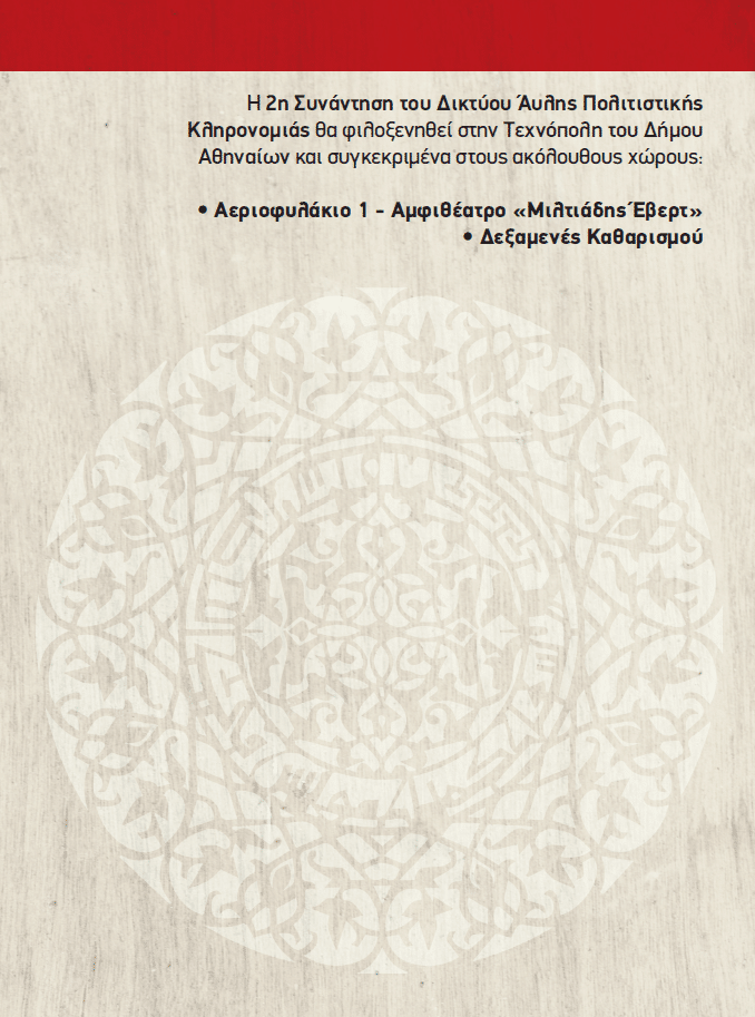 Mε χαρά σας ανακοινώνουμε ότι η 2η Συνάντηση του Δικτύου Άυλης Πολιτιστικής Κληρονομιάς, θα πραγματοποιηθεί από 21 έως 23 Φεβρουαρίου 2025 στην Τεχνόπολη του Δήμου Αθηναίων! Θα είναι ένα τριήμερο γεμάτο παρουσιάσεις από όλη την Ελλάδα, συζητήσεις στρογγυλής τράπεζας, εργαστήρια και παράλληλες δράσεις, μια ευκαιρία για δικτύωση και ανταλλαγή απόψεων, μια γιορτή στην καρδιά της πόλης!