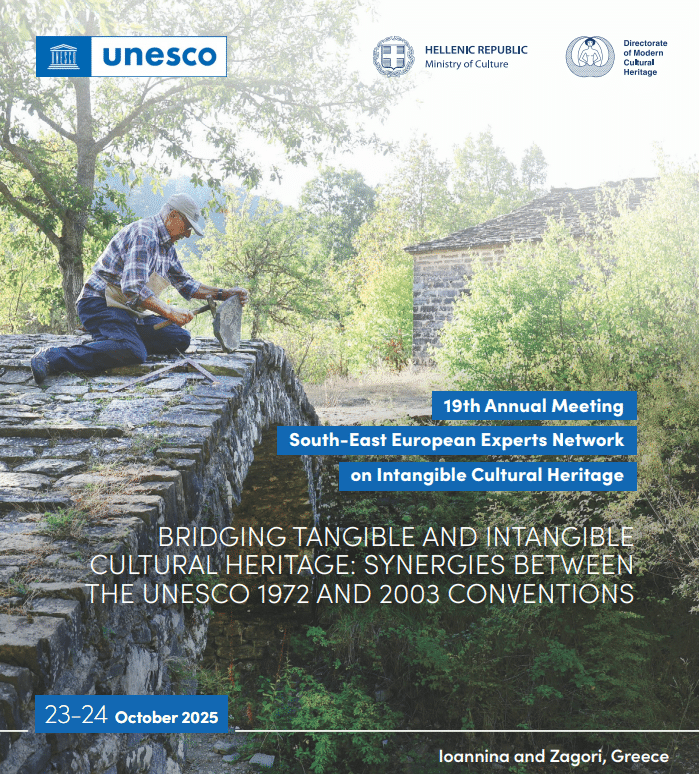 Με ιδιαίτερη επιτυχία πραγματοποιήθηκε στις 23 και 24 Οκτωβρίου 2025, στα Ιωάννινα και το Ζαγόρι αντίστοιχα, η 19η ετήσια συνάντηση με τίτλο «Bridging the Tangible and Intangible Cultural Heritage: Synergies between the UNESCO 1972 and 2003 Conventions» του Δικτύου εμπειρογνωμόνων χωρών της ΝΑ Ευρώπης στην Άυλη Πολιτιστική Κληρονομιά.
