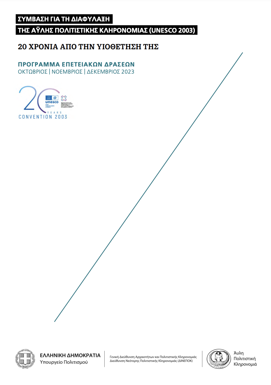 Το 2023 γιορτάζουμε σε όλο τον κόσμο τα 20 χρόνια από την υιοθέτηση της Διεθνούς Σύμβασης για τη Διαφύλαξη της Άυλης Πολιτιστικής Κληρονομιάς που αποτύπωσε και σε θεσμικό επίπεδο τις αλλαγές στην αντίληψή μας για την πολιτιστική κληρονομιά, δηλαδή τη ριζική διεύρυνση της έννοιας, η οποία πλέον αγκαλιάζει όχι μόνον τα υλικά μνημεία του παρελθόντος, αλλά και τις κοινωνικές και πολιτισμικές πρακτικές του παρόντος.