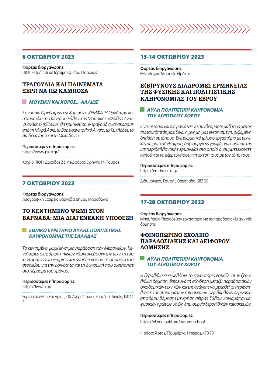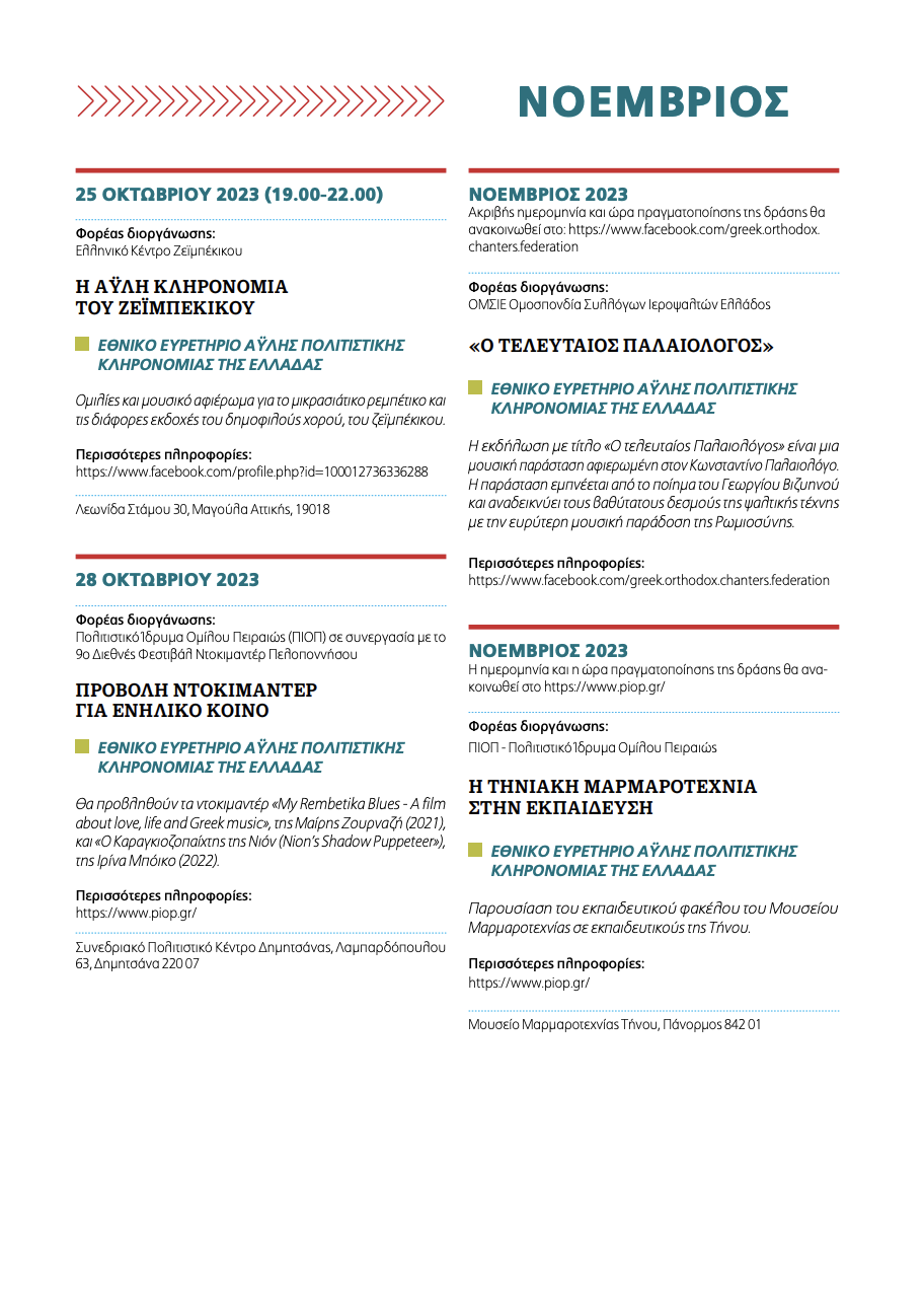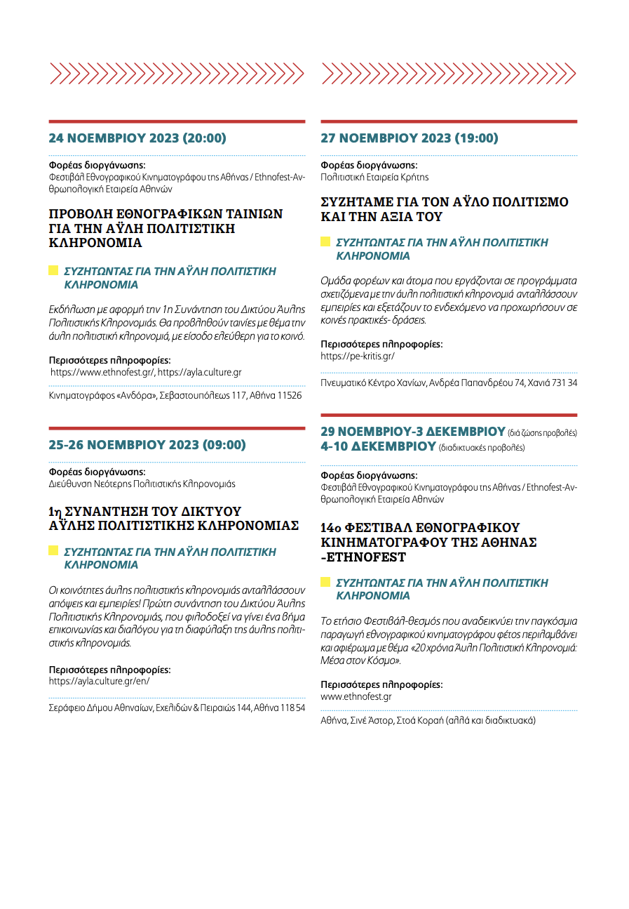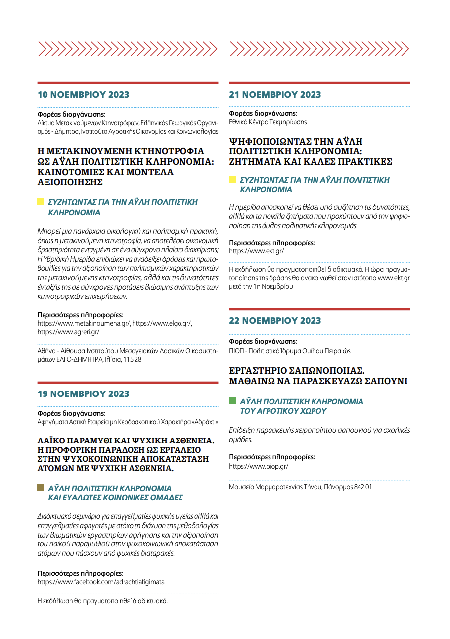 – Συζητώντας για την Άυλη Πολιτιστική Κληρονομιά | Ενδυναμώνοντας τον δημόσιο διάλογο μεταξύ κοινοτήτων, ειδικών εμπειρογνωμόνων και διοίκησης για τη μελέτη, διαφύλαξη και ανάδειξη της ζωντανής κληρονομιάς.
