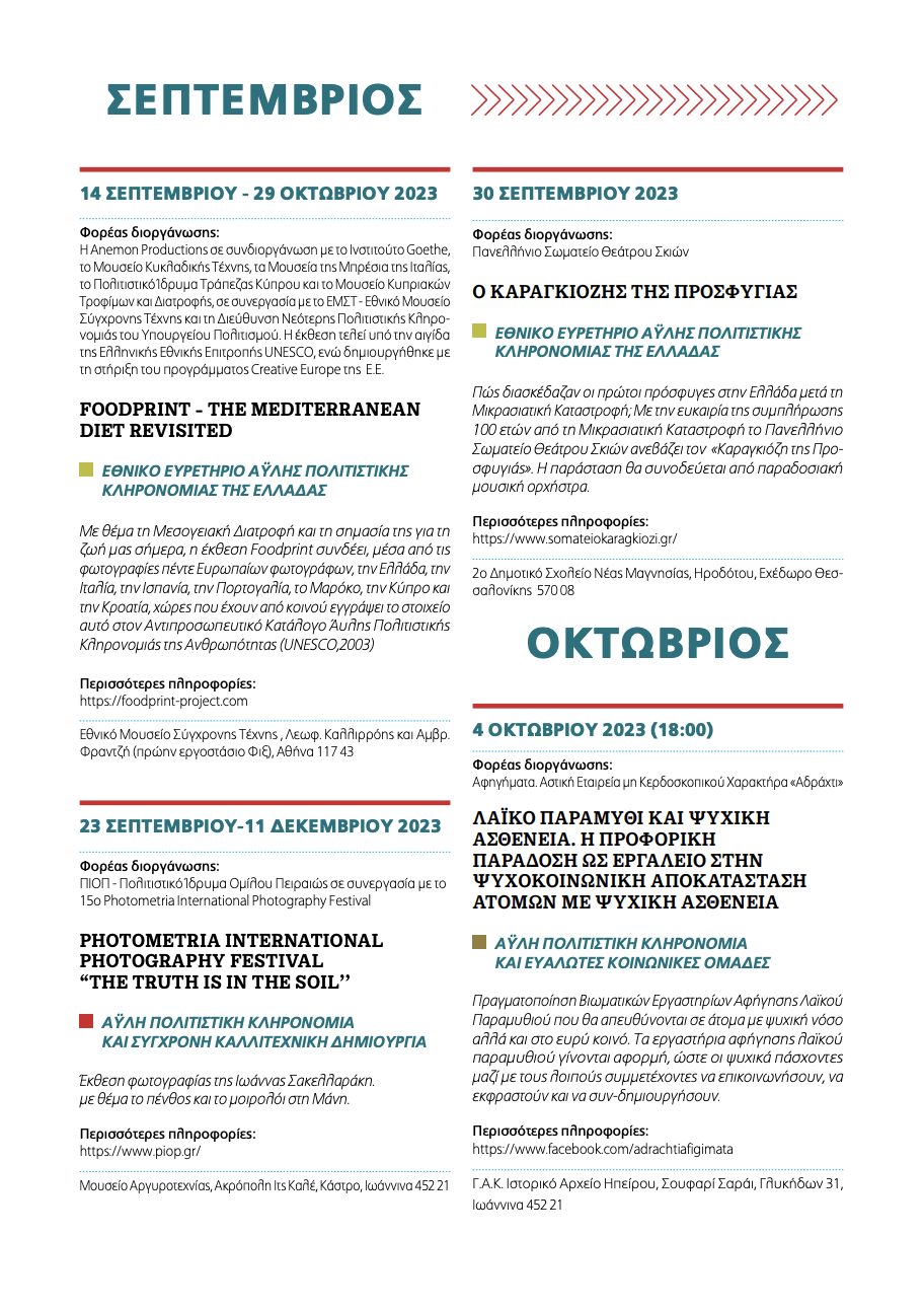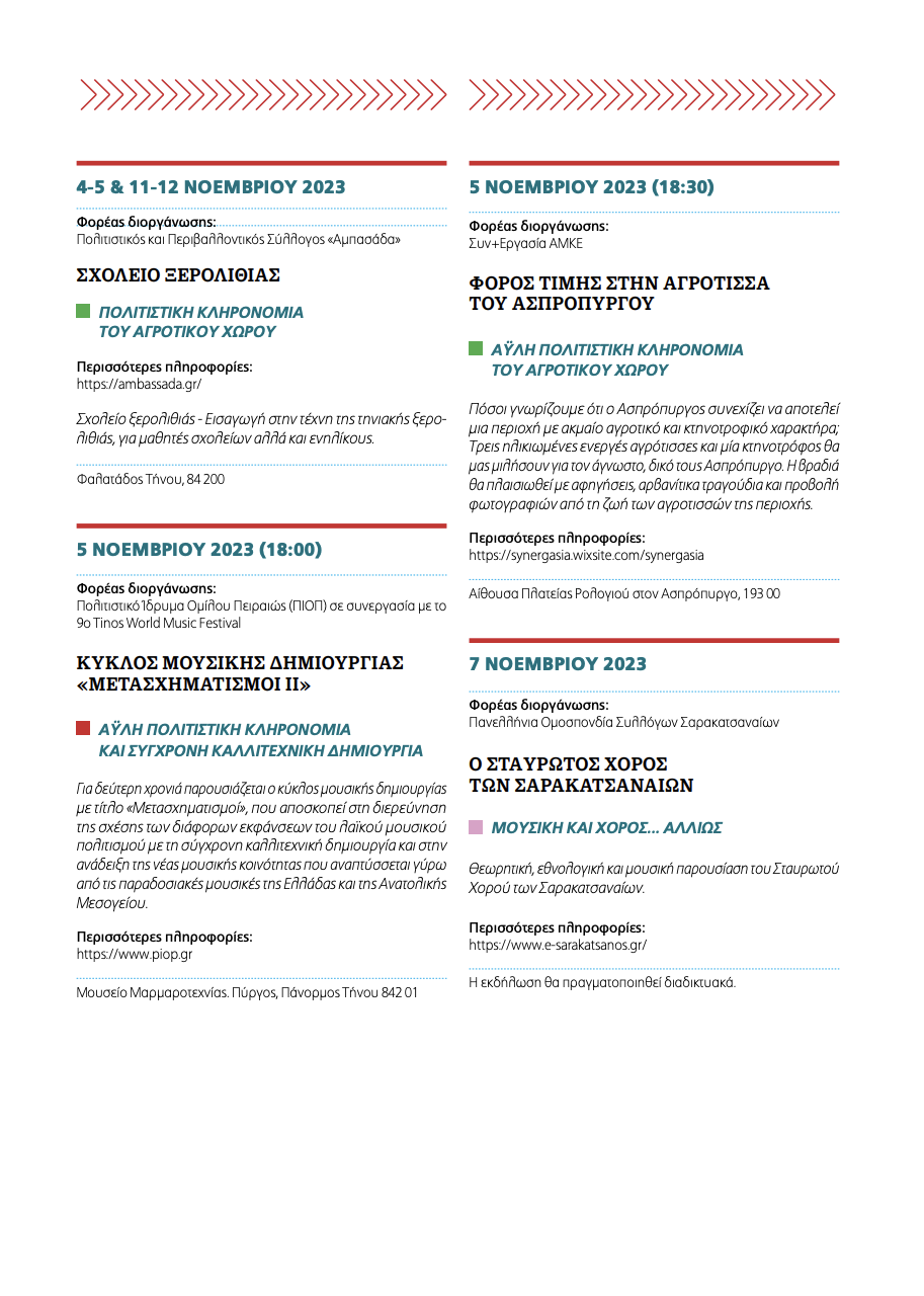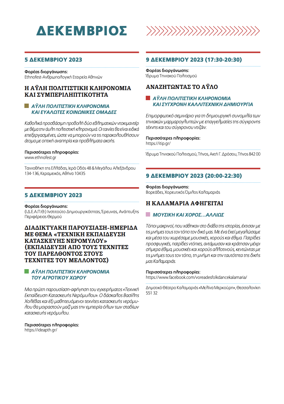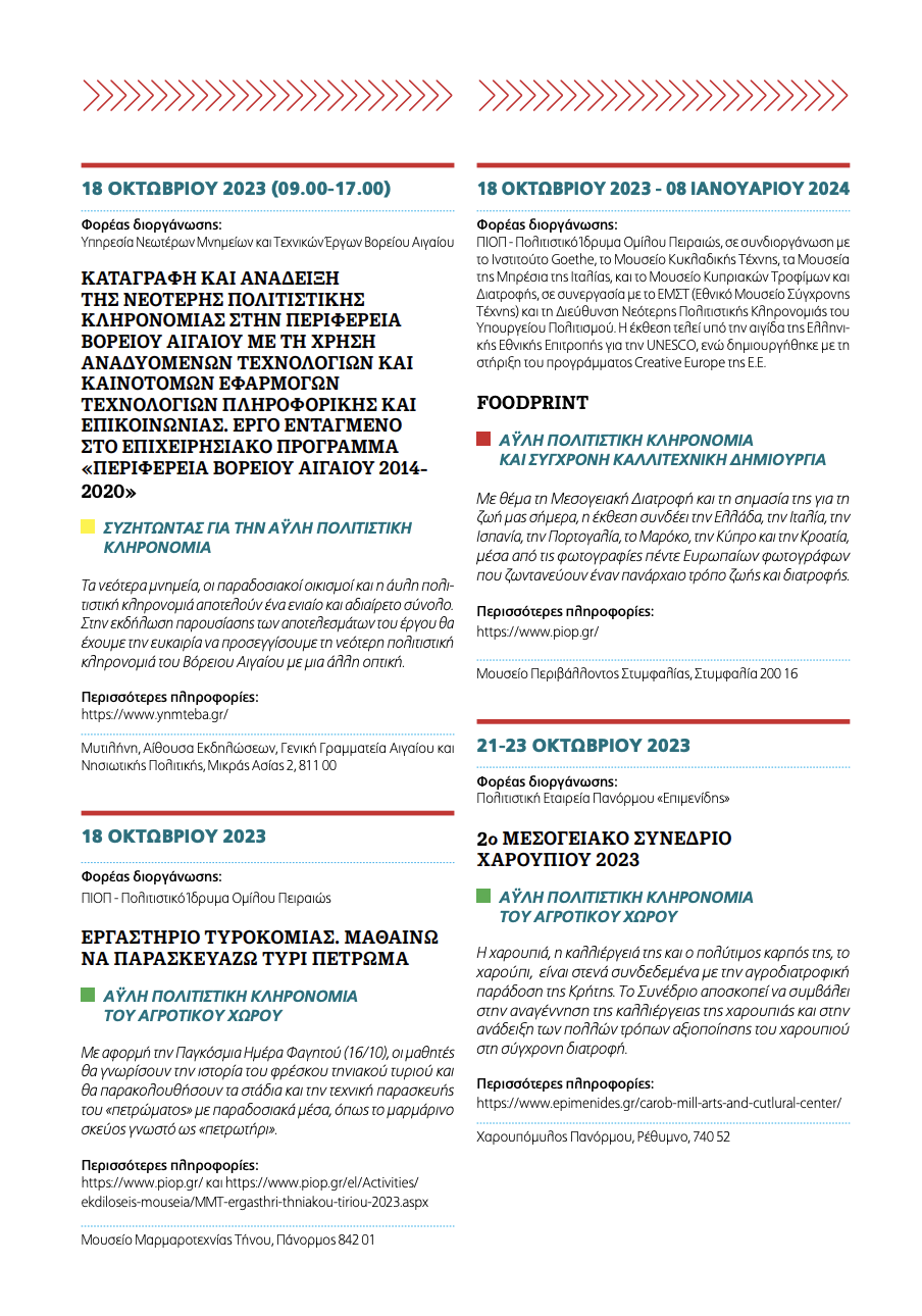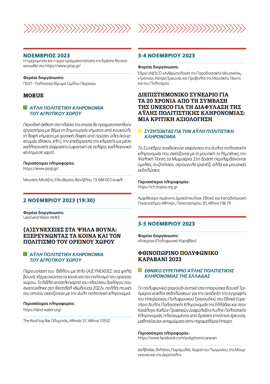 – Συζητώντας για την Άυλη Πολιτιστική Κληρονομιά | Ενδυναμώνοντας τον δημόσιο διάλογο μεταξύ κοινοτήτων, ειδικών εμπειρογνωμόνων και διοίκησης για τη μελέτη, διαφύλαξη και ανάδειξη της ζωντανής κληρονομιάς.