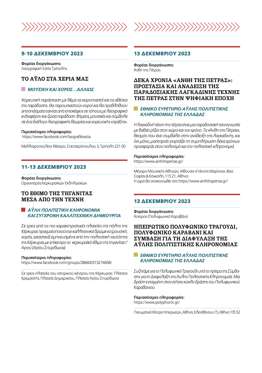 Στην Ελλάδα το 2023 γιορτάζουμε ταυτόχρονα και τα 10 χρόνια από τις πρώτες εγγραφές στο Εθνικό Ευρετήριο Άυλης Πολιτιστικής Κληρονομιάς της Ελλάδας, που είναι και το κύριο εργαλείο για την ανάδειξη και διαφύλαξη της ζωντανής κληρονομιάς. Στα δέκα αυτά χρόνια το Εθνικό Ευρετήριο έφτασε να περιλαμβάνει πάνω από εκατό εγγεγραμμένα στοιχεία.