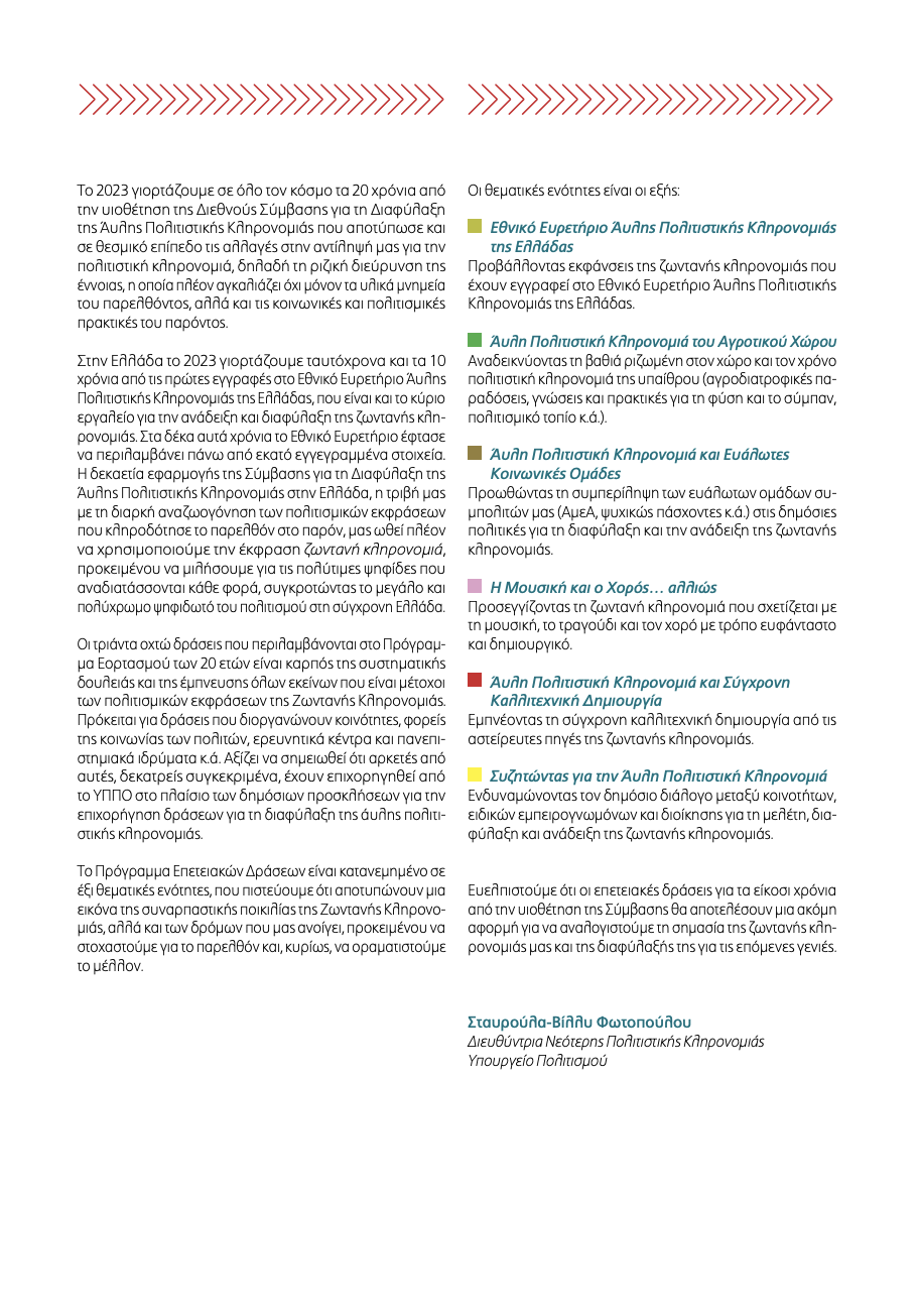 Ευελπιστούμε ότι οι επετειακές δράσεις για τα είκοσι χρόνια από την υιοθέτηση της Σύμβασης θα αποτελέσουν μια ακόμη αφορμή για να αναλογιστούμε τη σημασία της ζωντανής κληρονομιάς μας και της διαφύλαξής της για τις επόμενες γενιές.
