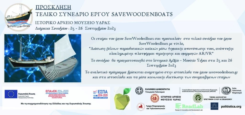 του έργου SaveWoodenBoats σας προσκαλούν στο τελικό συνέδριο του έργου SaveWoodenBoats με τίτλο, “Διάσωση ξύλινων παραδοσιακών καϊκιών μέσω ψηφιακής αποτύπωσης τους, ανάπτυξης ολοκληρωμένης πλατφόρμας περιήγησης και εφαρμογών AR/VR”⛵
